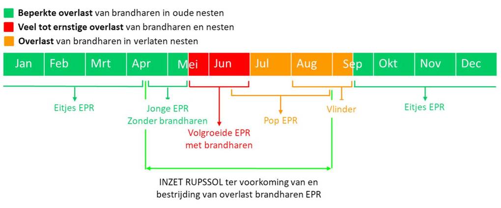 Gezondheidsrisico’s voor mens en dier ontstaan door rechtstreeks contact met de brandharen van de eikenprocessierups. In de periode van half mei tot en met juni zijn de rupsen volgroeid en begint de periode van overlast. Door verspreiding en verwaaiing houdt deze overlast aan tot midden september. Brandharen blijven zes tot acht jaar actief doordat de structuur van de haren niet wordt afgebroken